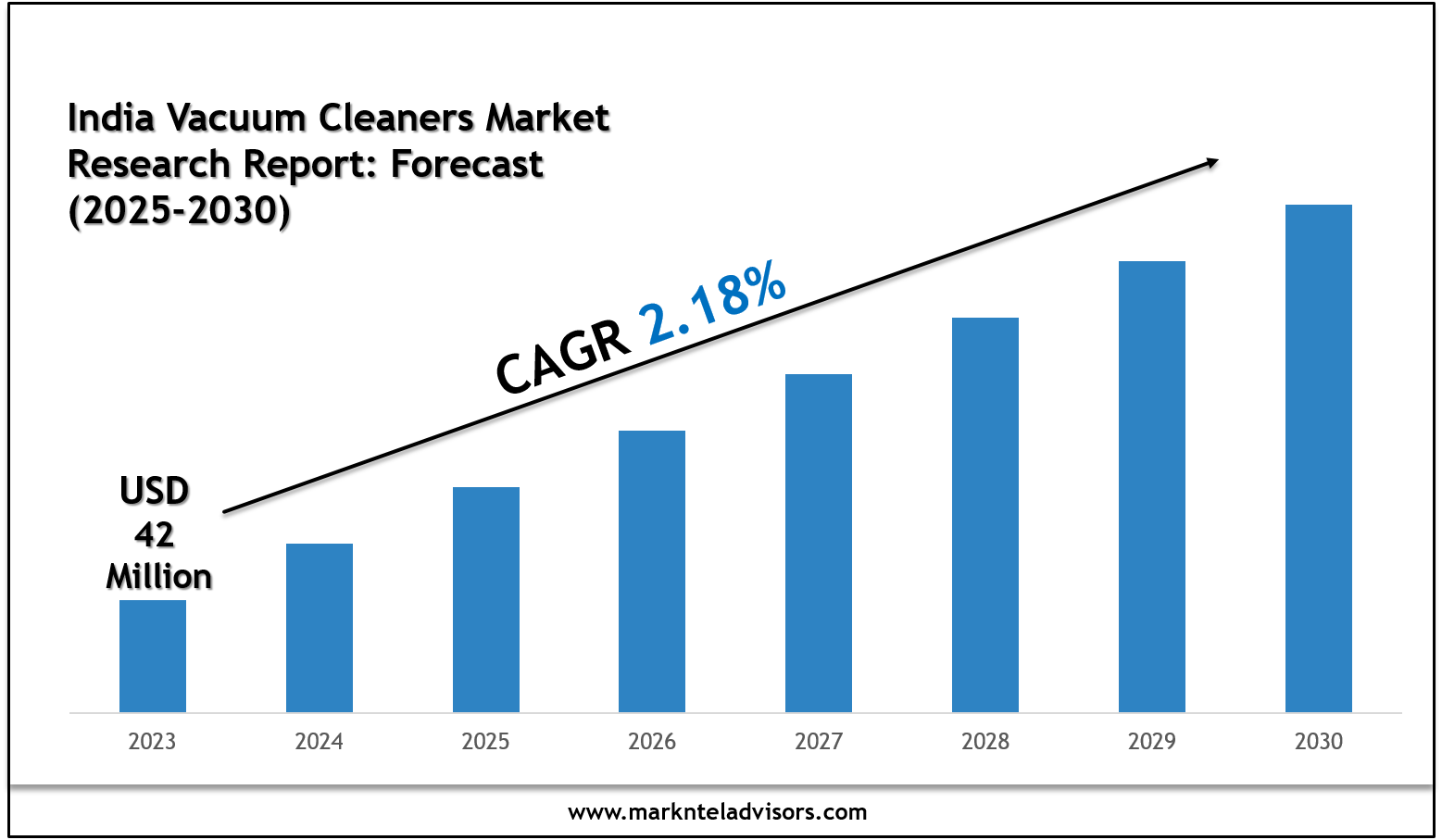 The India Vacuum Cleaners Market is valued at around USD 42 million in 2023 and is estimated to grow at a CAGR of about 2.18% during the forecast period, i.e., 2025-30. The market growth is primarily driven by the rapidly growing awareness among the Indian population about various benefits of vacuum cleaners, such as removing and lifting dirt & dust, effectively cleaning the environment to reduce the risks of allergies, etc. India is experiencing rapid urbanization, with a significant portion of its population migrating to cities.